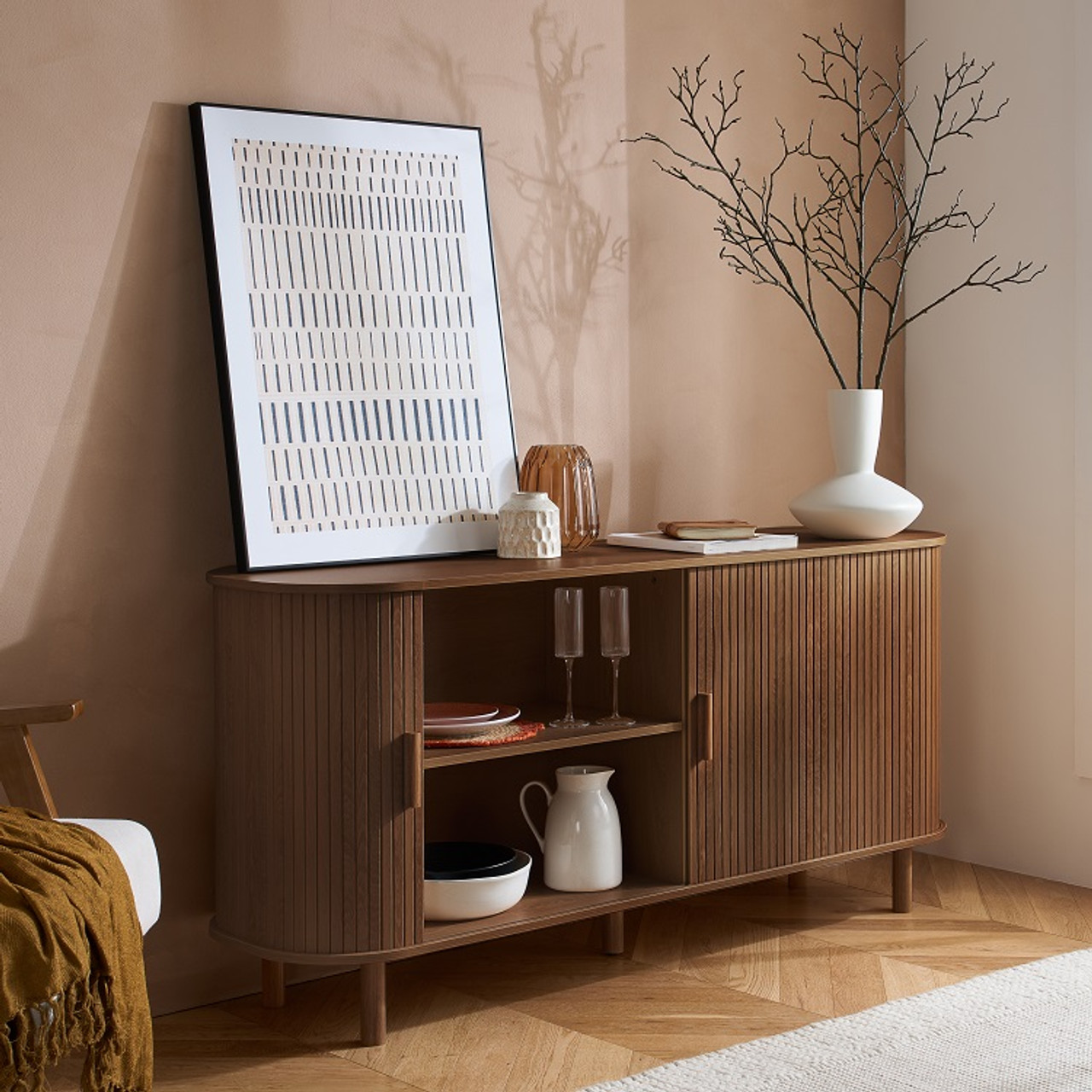 Birlea Axel 2 Door Fluted Sideboard in Walnut — Introducing our stunning Fluted Dining Range, a perfect blend of contemporary elegance and functional design. Crafted from high-quality MDF, this versatile collection is available in both oak and black finishes, catering to a variety of interior styles and preferences. Featuring exquisite fluted detailing that adds a touch of sophistication and modern charm to your living space. With its robust construction and elegant finishes, the Fluted Dining Range is designed to be both stylish and durable. The sleek lines and fluted textures not only enhance the aesthetic appeal but also create a cohesive look across your dining and living areas. Whether you're furnishing a cosy apartment or a spacious home, the Fluted Dining Range offers the perfect combination of form and function, making it an ideal choice for any contemporary living space. Elevate your home decor with the timeless elegance and modern flair of the Fluted Dining Range.