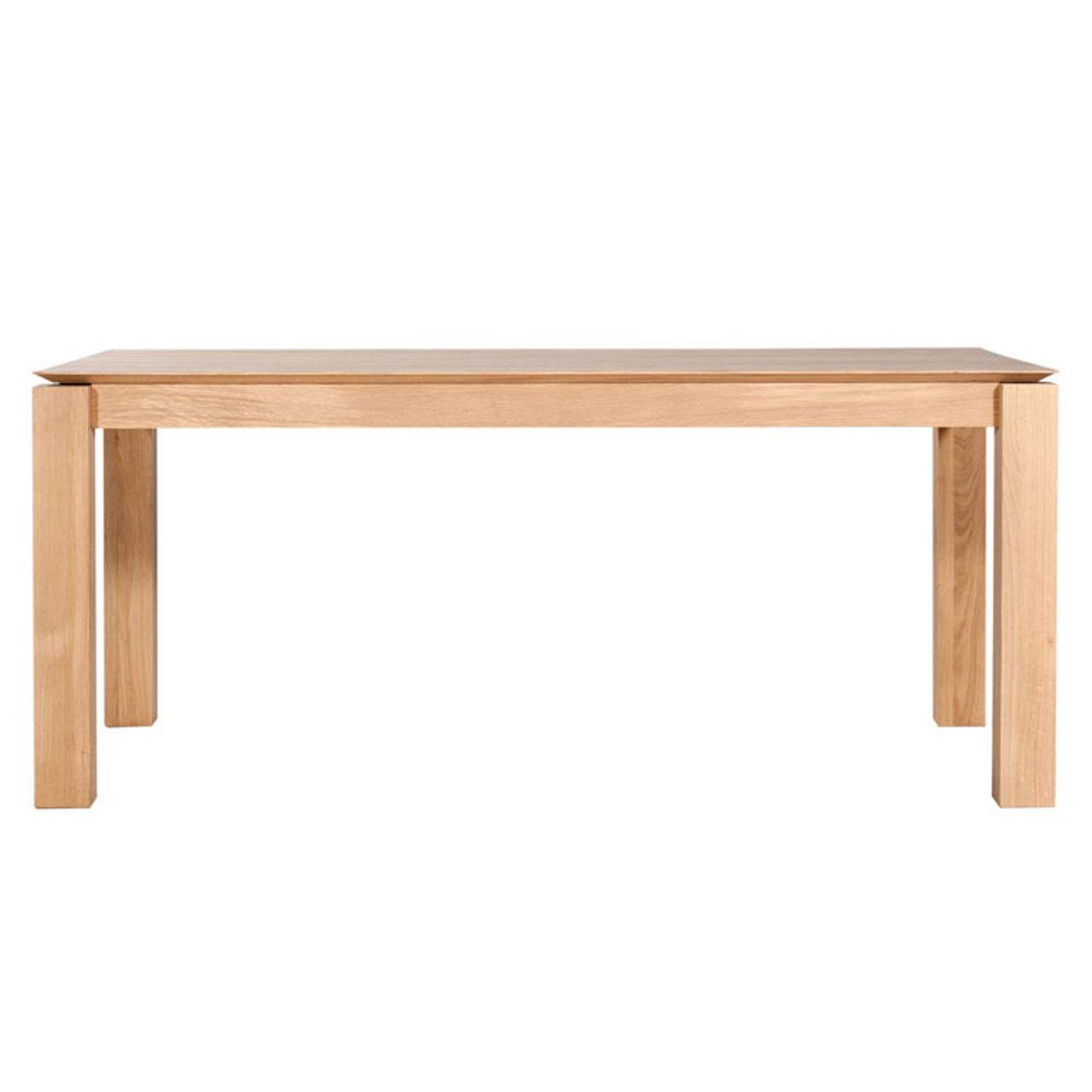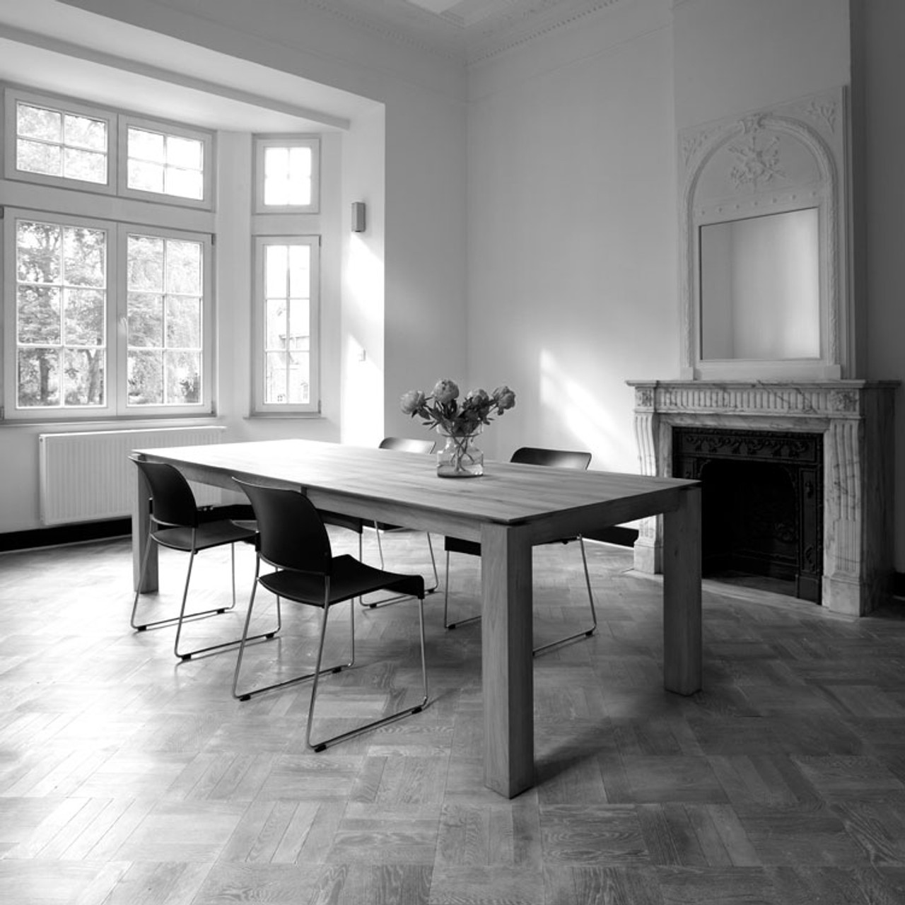 Made by Ethnicraft, this is the finest contemporary extending oak dining table design on the market today (our humble opinion). This light Oak dining table named 'Slice' has chunky 8cmx8cm (larger sizes 10x10cm) legs and a clean-lined 'sliced' edge solid Oak top. It has an integrated butteryfly extension leaf which extends on one end of the table in a way that practically invisible and with a really smooth and easy action. This beautiful extendable solid Oak table is made by our award-winning Belgian supplier using only the finest European Oak and has a lovely natural looking matt oil finish.