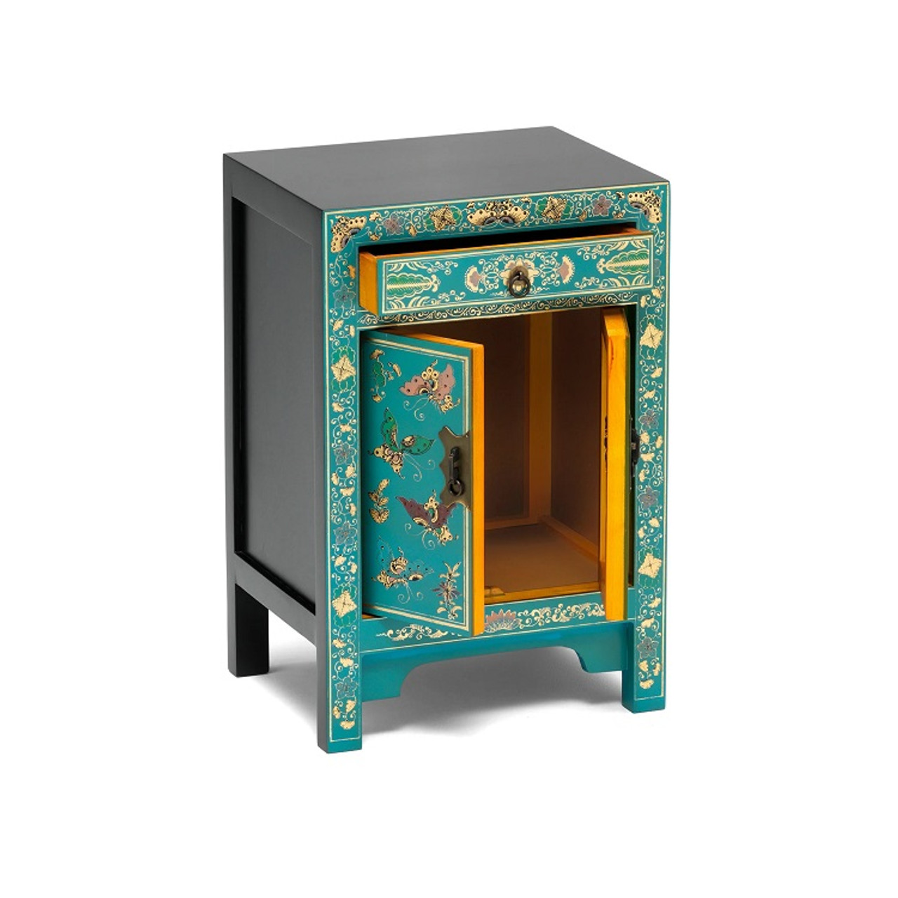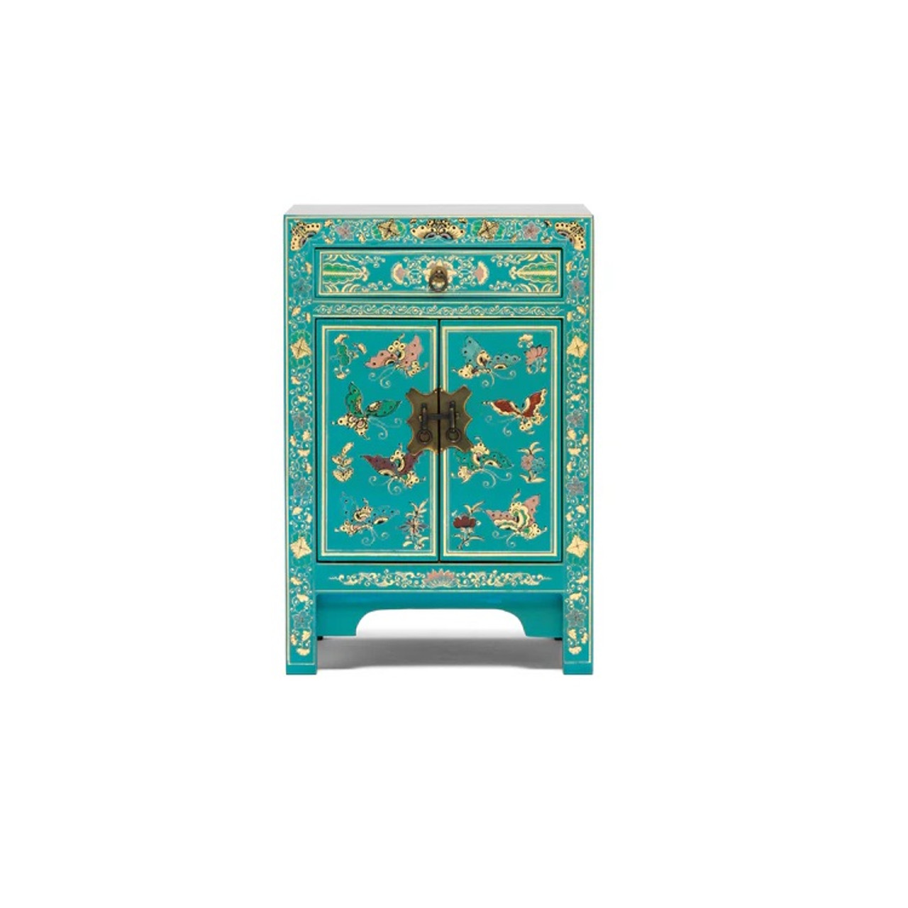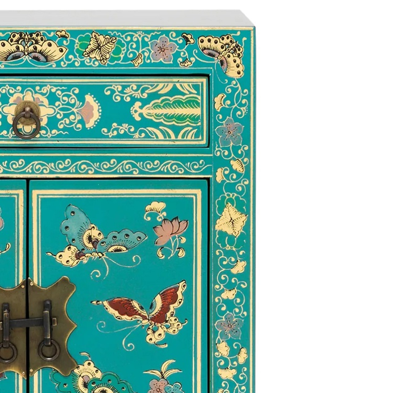 Bring timeless elegance into your home with the Chinese Style Chinese Lacquer Butterfly Lacquer Storage Cabinet Teal Blue, beautifully finished with authentic Chinese-style detailing.