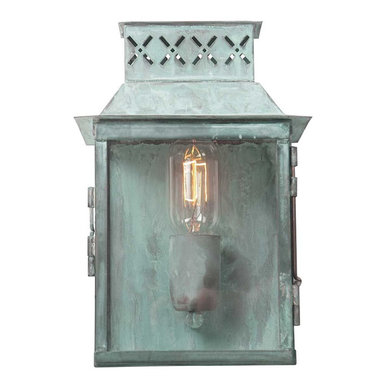 The Elstead Lambeth Palace wall lantern is a solid brass lantern with a verdigris finish, influenced by pre-Georgian originals.