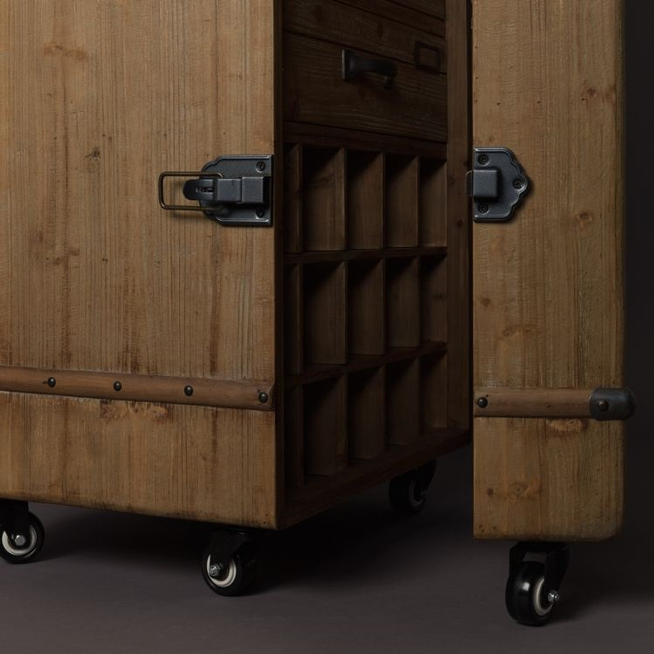 Vintage Wood Drinks Cabinet on Wheels – a true conversation piece for any home. Crafted from solid fir wood with black iron fittings, this beautifully detailed cabinet brings industrial charm and vintage warmth together. Designed like a classic travel trunk, it opens to reveal a complete home bar setup with bottle storage, drawers and hanging glass racks – all built for entertaining in style.