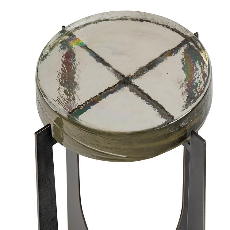 Libra Glenthorpe Accent Table – Gilded Oak Frame & Hammered Glass H60cm — The Glenthorpe Accent Table features a clear, hammered brick-glass top resting on a sculptural laser-cut iron base with a gilded oak wood finish. Compact yet expressive, its arched silhouette embodies the current shift towards statement shapes and material-led design, where form and texture play a central role. The interplay of textured glass and warm metal lends a crafted, contemporary character that works beautifully in both modern and transitional schemes. Complements the Glenthorpe Console Table, Coffee Table, Floor Lamp and Table Lamp.