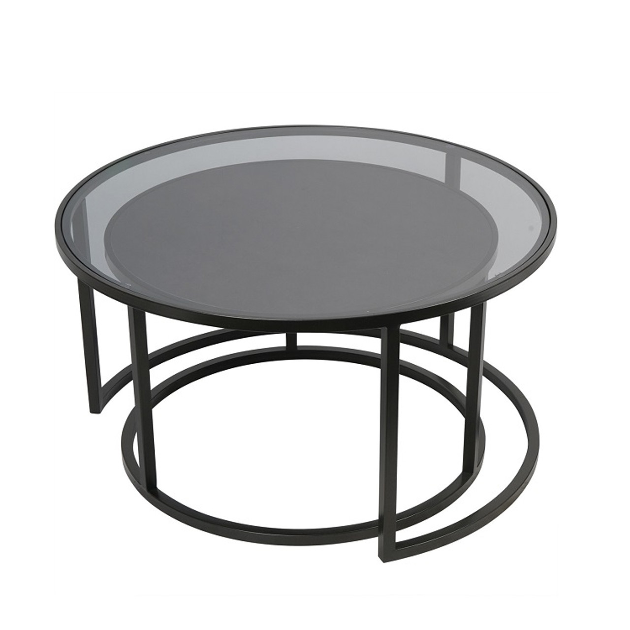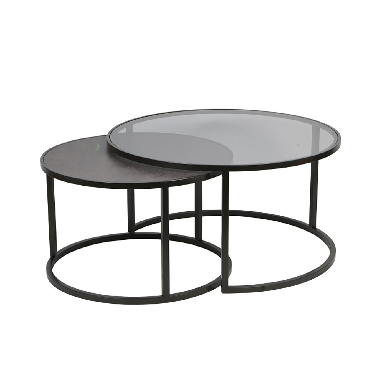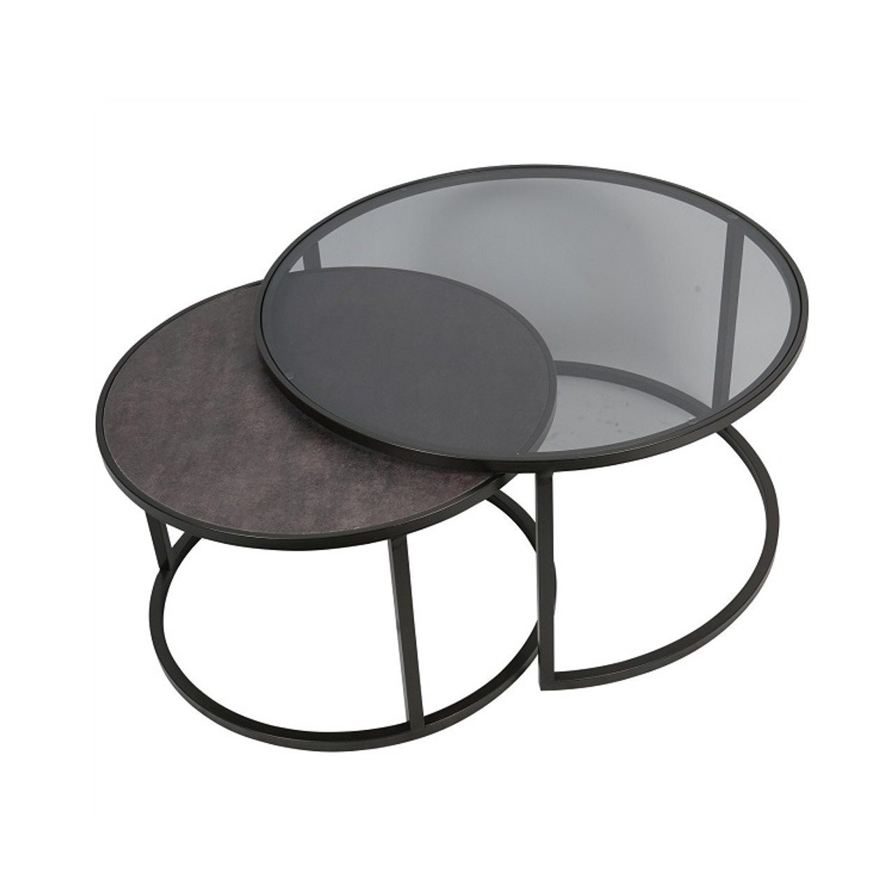 Libra Turner Set of 2 Nesting Coffee Tables – Clear Glass & Slate‑Effect 79/62×79/62×42/39cm — a modern nesting coffee table set with a large clear glass top and a smaller slate‑effect top, both on sleek metal frames.
