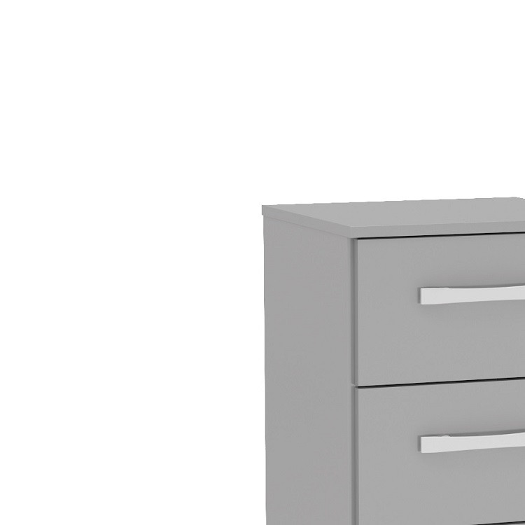Lynx 3 Drawer Bedside in Grey — Modern and sleek, the Lynx 3 drawer bedside combines a high-gloss finish with bold silver detailing to make any space feel contemporary. The top panel of this bedside can support up to 5 kg of weight and each drawer can support up to 2.5 kg. The front of the unit has a high-gloss finish.