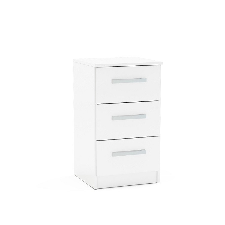 Lynx 3 Drawer Bedside in White — Modern and sleek, the Lynx 3 drawer bedside combines a high-gloss finish with bold silver detailing to make any space feel contemporary. The top panel of this bedside can support up to 5 kg of weight and each drawer can support up to 2.5 kg. The front of the unit has a high-gloss finish.