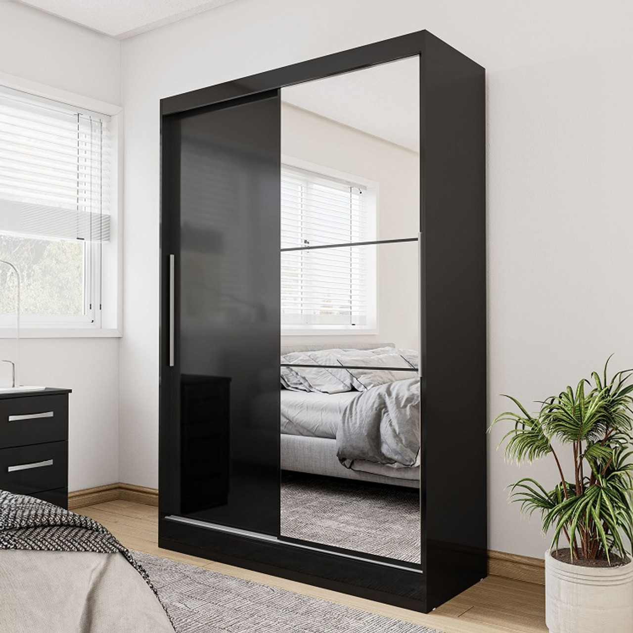 Lynx 2 Door Sliding Wardrobe With Mirror in Black — Modern and sleek, the Lynx 2 door sliding wardrobe with mirror combines a high-gloss finish with bold silver detailing to make any space feel contemporary. Constructed from MDP (multiple density particleboard), this high-quality wardrobe features a sliding mirrored door plus an internal top shelf for additional bedroom storage. The top shelf can support up to 15 kg of weight and the hanging rail can support up to 10 kg. The base panel of this wardrobe can support up to 20 kg of weight. The front of the unit has a high-gloss finish.