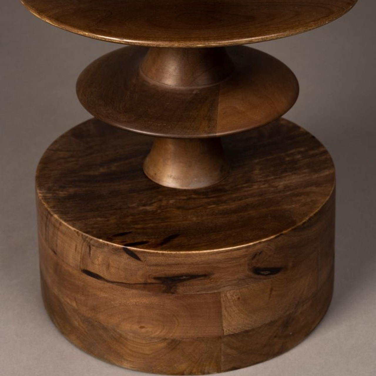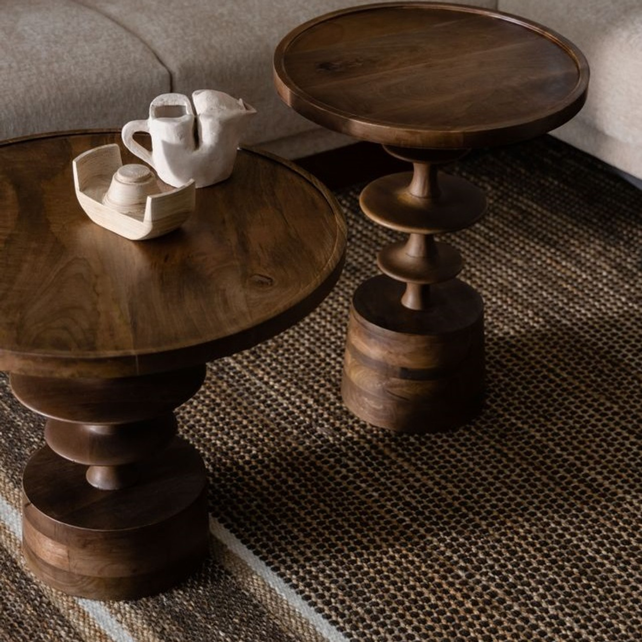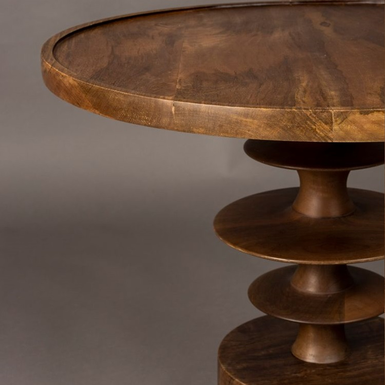 Walnut Mango Wood Round Coffee Table – a sculptural statement piece that captures the essence of Mid-Century Modern design. Crafted entirely from solid mango wood with a beautiful walnut-coloured finish, this table combines organic curves with timeless craftsmanship. Its tiered pedestal base adds visual interest and elegance, making it the perfect focal point for any living space.