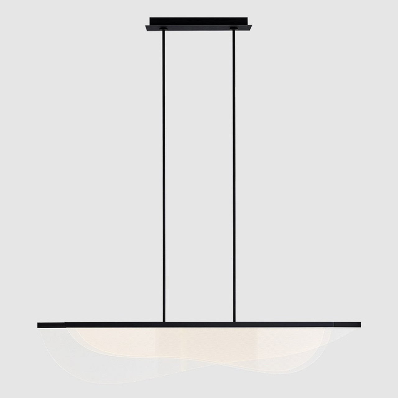 A contemporary LED suspension light featuring layered acrylic panels with wave-like contours, delivering 3000 lumens of warm illumination (3000K) via advanced light guide technology. Finished in Nightshade Black, this 152.4cm fixture offers a sleek, sculptural presence ideal for modern interiors. Adjustable hanging length (45.72cm–243.84cm) and 70W output make it suitable for dining areas, kitchens, or open-plan spaces. Coordinates seamlessly with Nyra chandeliers and pendants for a cohesive lighting scheme.
