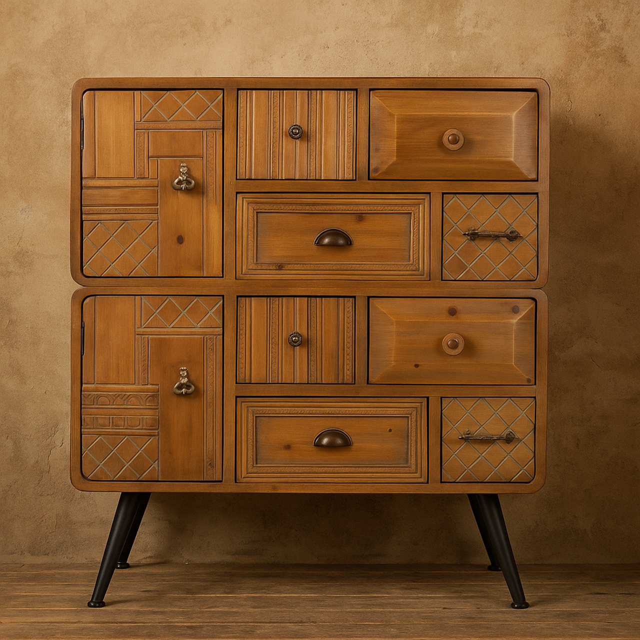 You gain an artwork for the home with the Dutchbone Jove. The different patterns and handles on the doors and drawers are so intriguing that you can't tear your eyes away. Every look reveals something new! With that and its conical iron legs, the cabinet has a lovely vintage look that could have come straight out of the 1960s or 70s. Your home gains something truly unique with this pine wood furniture piece.