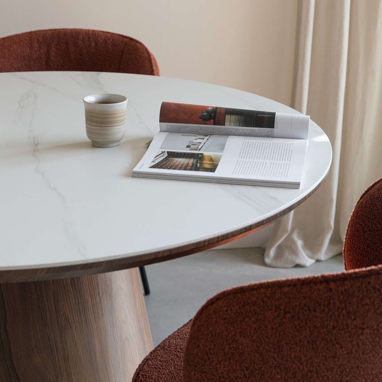 The Lucerne Oval Dining Table combines the timeless elegance of a Carrara marble ceramic top with the warmth and sophistication of walnut wood, making it a standout centerpiece for any dining space. Its sleek design features contrasting smooth edges, providing a refined and sophisticated look, while the sturdy central pedestal ensures excellent stability and maximizes legroom and seating capacity.