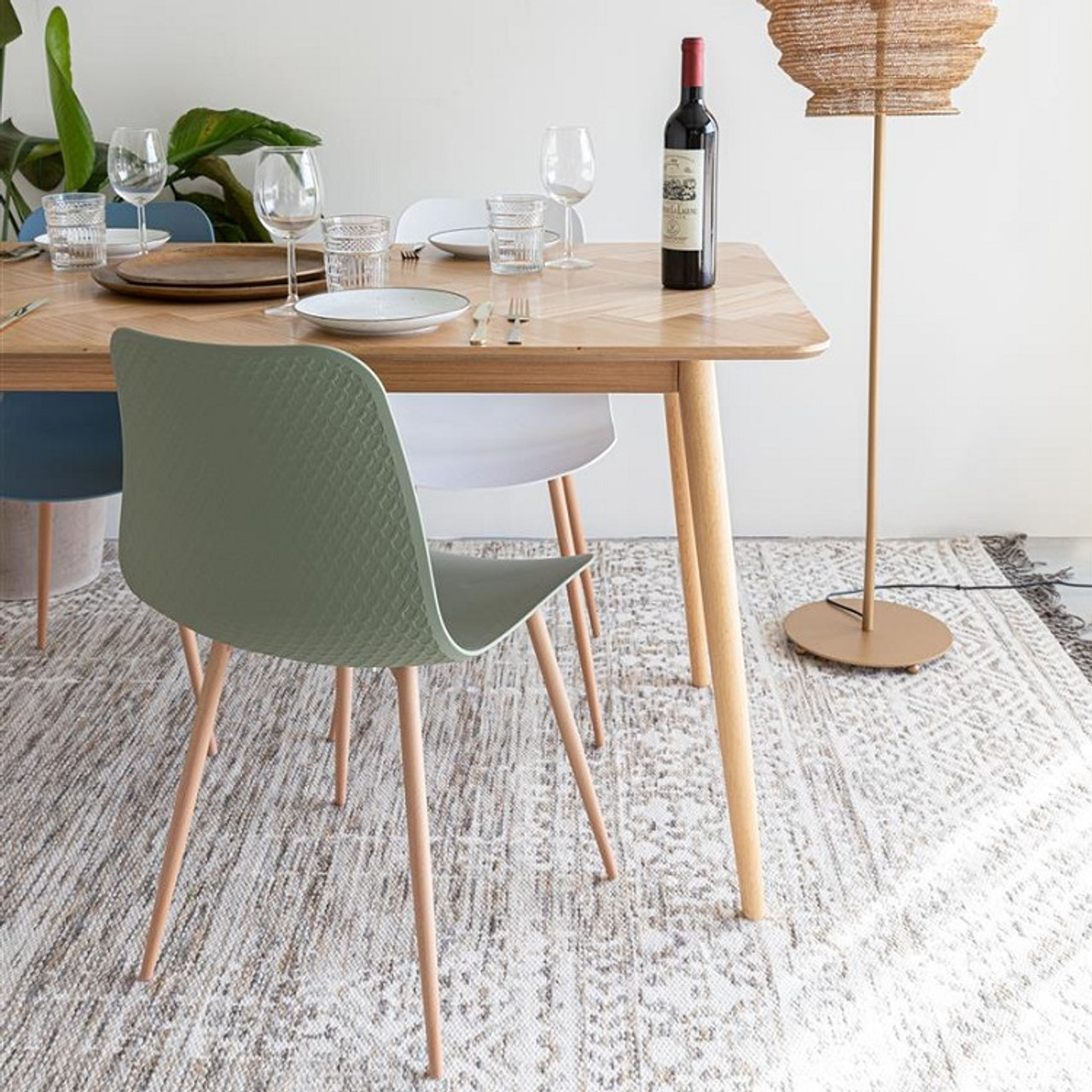 The rectangular oak dining table from the Basel collection combines timeless craftsmanship with contemporary elegance. The tabletop features a beautifully arranged herringbone oak veneer, showcasing the wood’s natural grain and texture. Measuring 160 cm in length, this table comfortably seats up to six people, making it ideal for family dining or entertaining guests. Its slim tapered legs and soft edges give it a refined, Scandinavian-inspired look that suits both modern and classic interiors.
