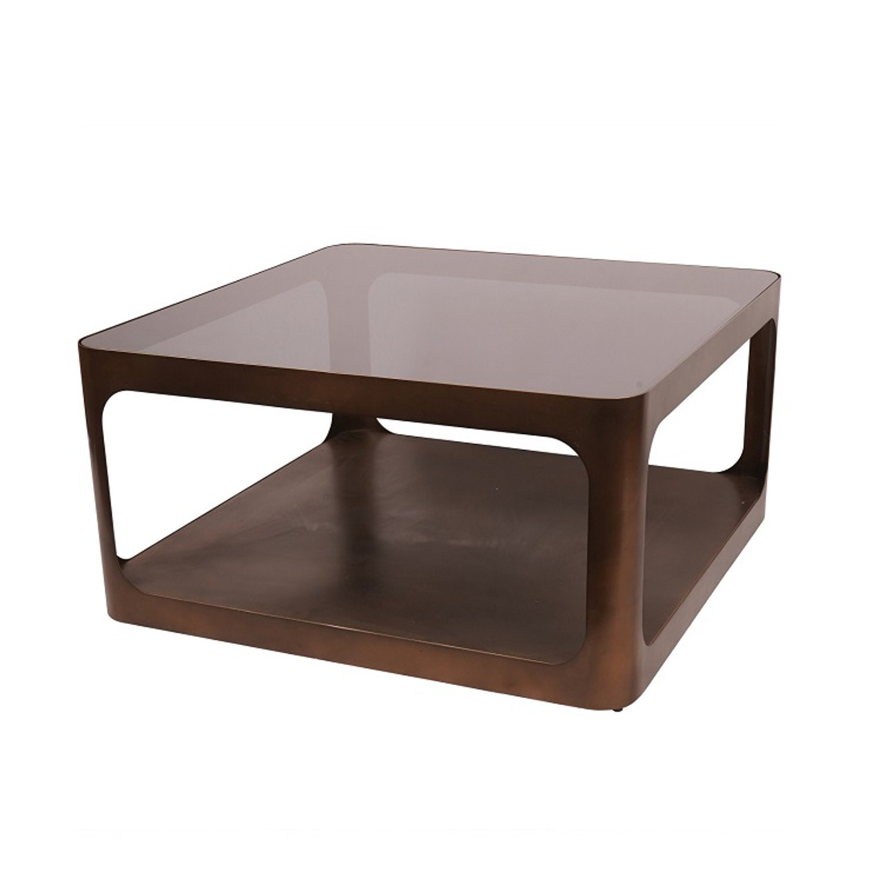 - Sculptural square coffee table in smoked bronze with black-tinted glass and a practical lower shelf.